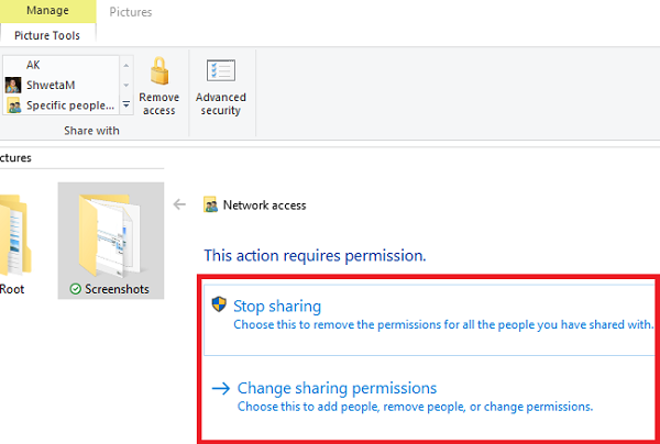 Open File ExplorerNavigate to the folder or file you want to share, and select it.On the Ribbon menu, switch to ShareHere you have one-click option to Remove Access, i.e., stop sharing, and also a list of users with whom you can share the files.When you click on Specific people option, it will open the Network Access window which we saw in the above method.